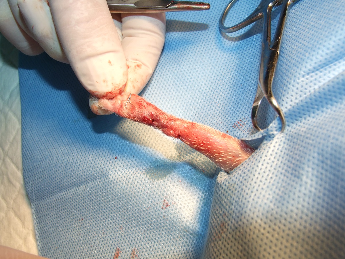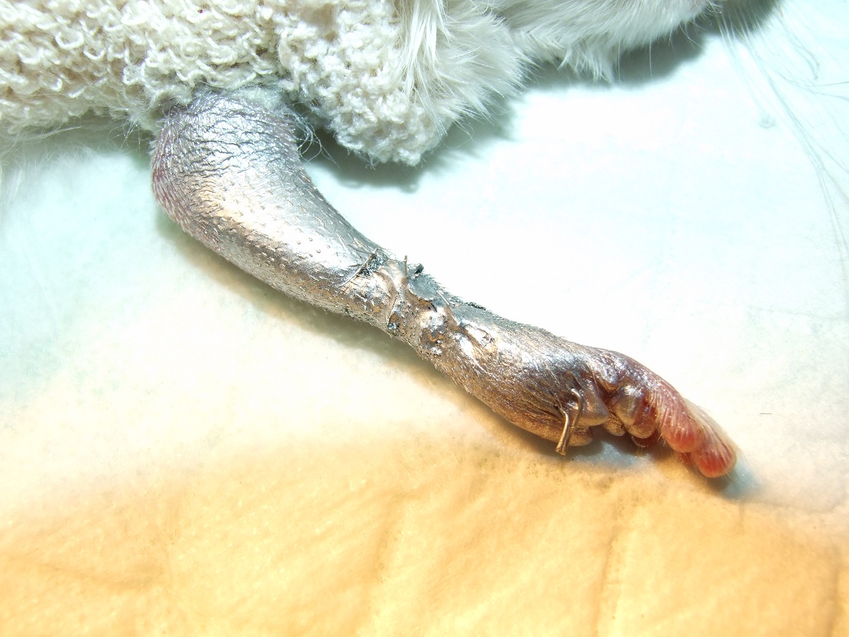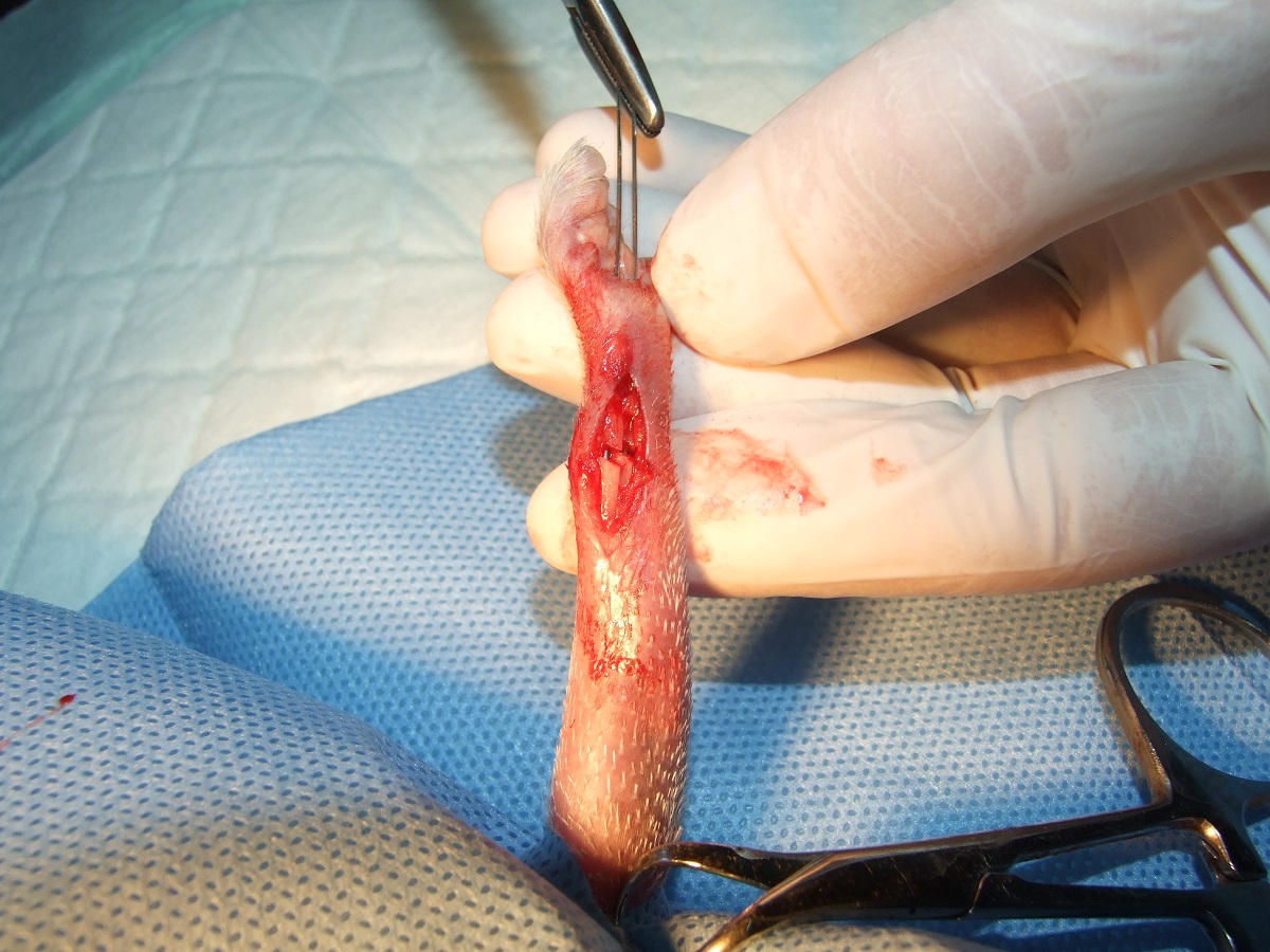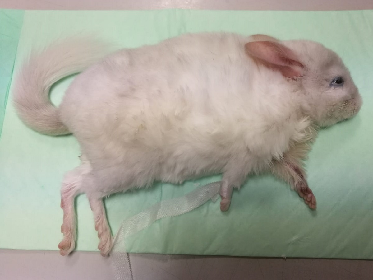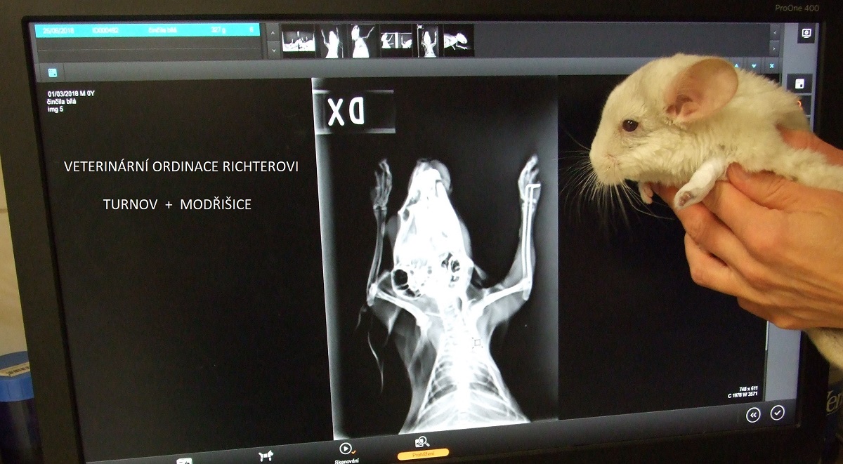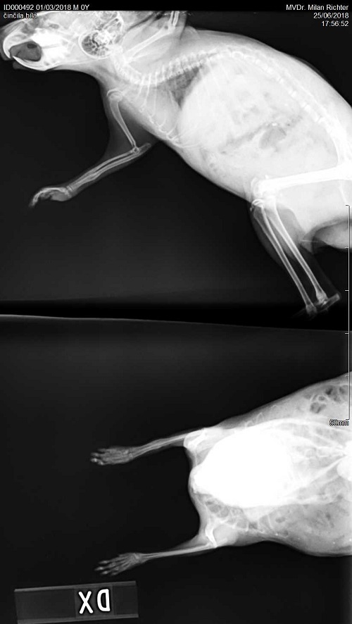Velmi komplikovaná fraktura obou předloketních kostí u drobné činčily, jelikož se tak drobné implatáty běžně nevyrábějí, řešili jsme ji implantací nitrodřeňových hřebů vyrobených z injekčních jehel. Pacient se kompletně a bez následků uzdravil, po vyjmutí hřebů nožičku naplno používá.