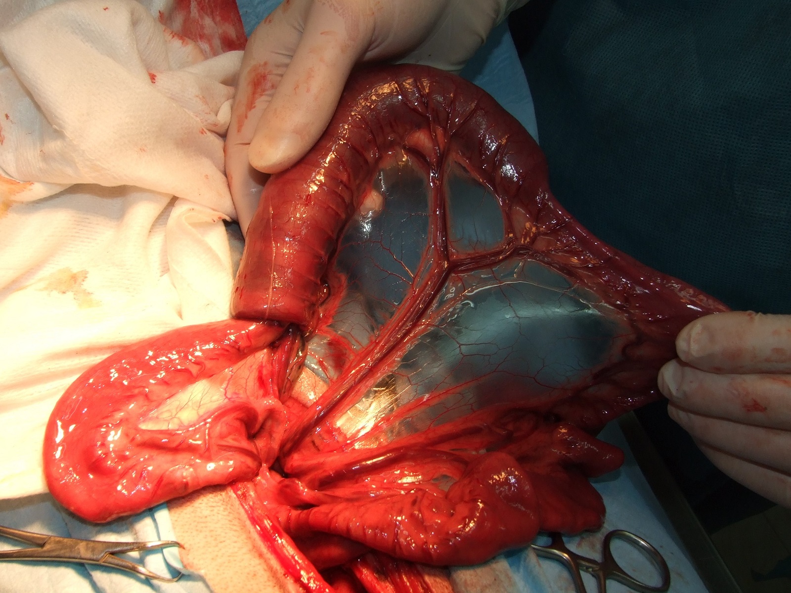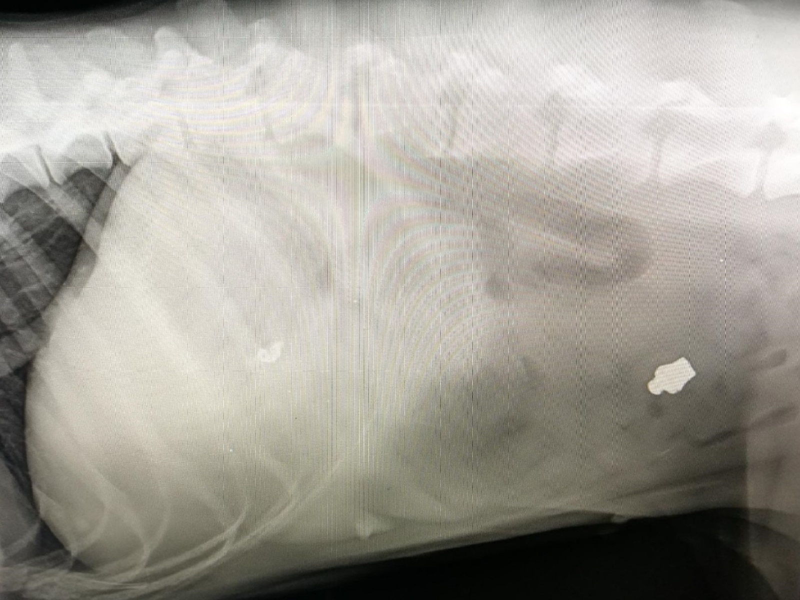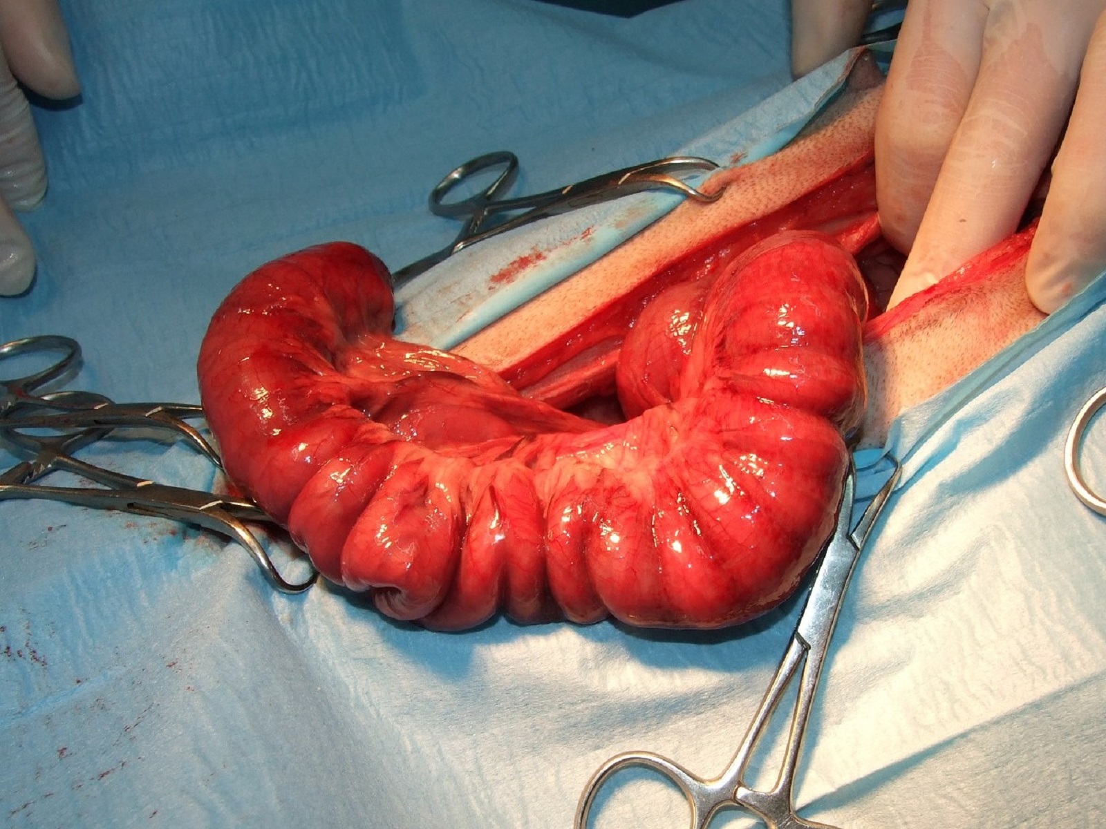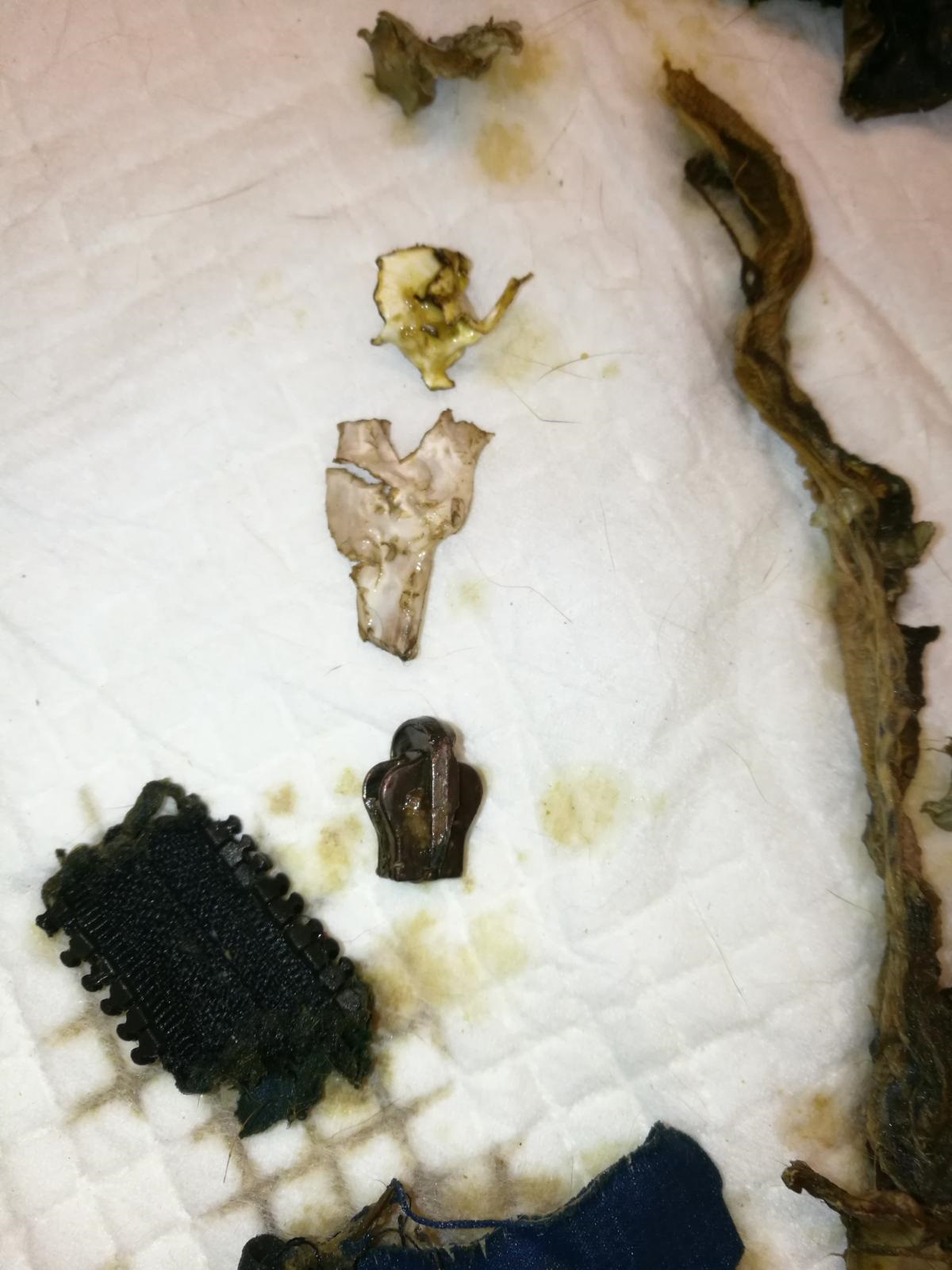 Lineární cizí těleso u 11měsíčního ridgebacka - z rozkousané bundy se zipem a plastového předmětu se vytvořilo lineární cizí těleso bezprostředně ohrožující život, které se na jednom konci zachytilo v žaludku a na druhý konec se navlékla cca 1/2 tenkého střeva. Za ní se bohužel vytvořila tzv invaginace - vchlípení jednoho úseku tenkého střeva do druhého. Kovový jezdec, který byl velmi dobře patrný na rentgenu, byl paradoxně volně v tlustém střevě a nezpůsoboval významnější obtíže. Museli jsme na několika místech vstoupit do žaludku a střev, přerušit a vyjmout cizí těleso, uvolnit vchlípení, zrevidovat životaschopnost střev a po zhodnocení stavu a perfuze krví uvést vše do původního stavu a dutinu břišní po výplachu uzavřít. Pacientovi se daří dobře, střeva fungují a už sám přijímá potravu.