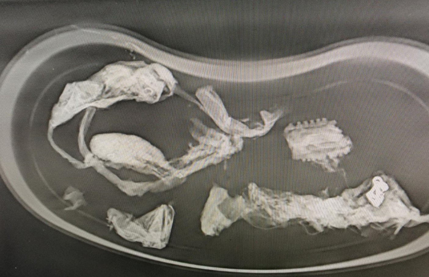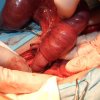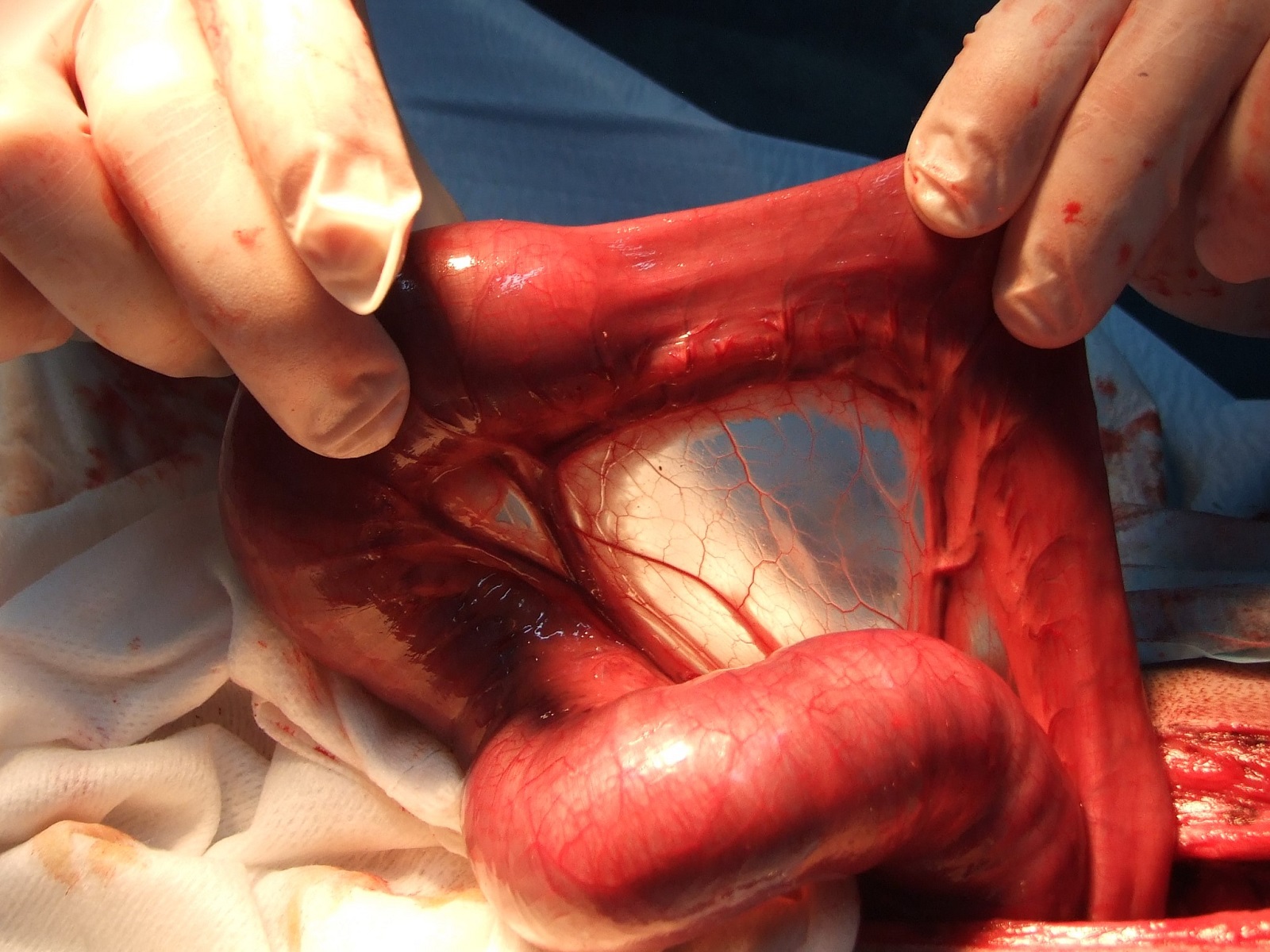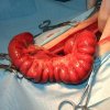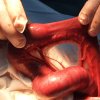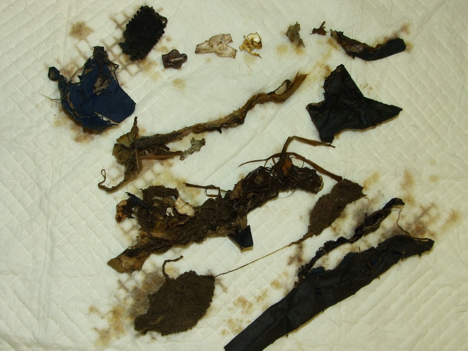 Lineární cizí těleso u 11měsíčního ridgebacka - z rozkousané bundy se zipem a plastového předmětu se vytvořilo lineární cizí těleso bezprostředně ohrožující život, které se na jednom konci zachytilo v žaludku a na druhý konec se navlékla cca 1/2 tenkého střeva. Za ní se bohužel vytvořila tzv invaginace - vchlípení jednoho úseku tenkého střeva do druhého. Kovový jezdec, který byl velmi dobře patrný na rentgenu, byl paradoxně volně v tlustém střevě a nezpůsoboval významnější obtíže. Museli jsme na několika místech vstoupit do žaludku a střev, přerušit a vyjmout cizí těleso, uvolnit vchlípení, zrevidovat životaschopnost střev a po zhodnocení stavu a perfuze krví uvést vše do původního stavu a dutinu břišní po výplachu uzavřít. Pacientovi se daří dobře, střeva fungují a už sám přijímá potravu.