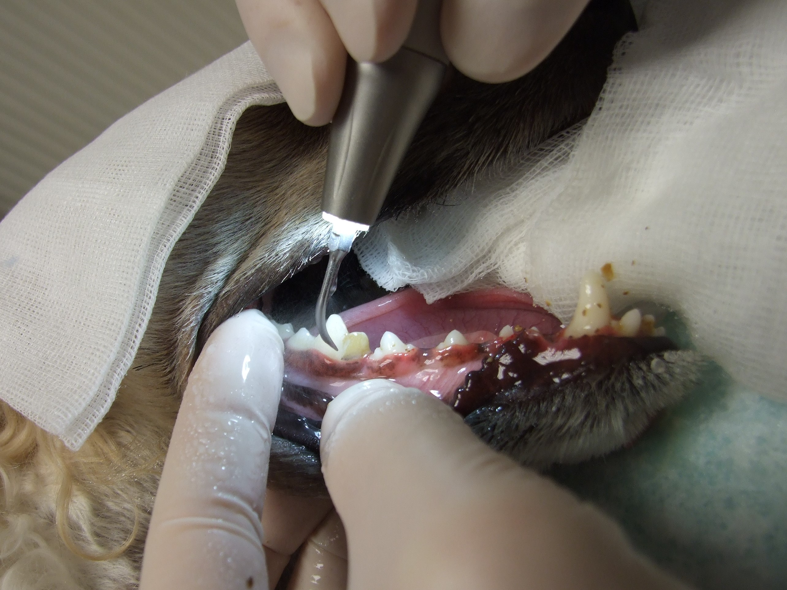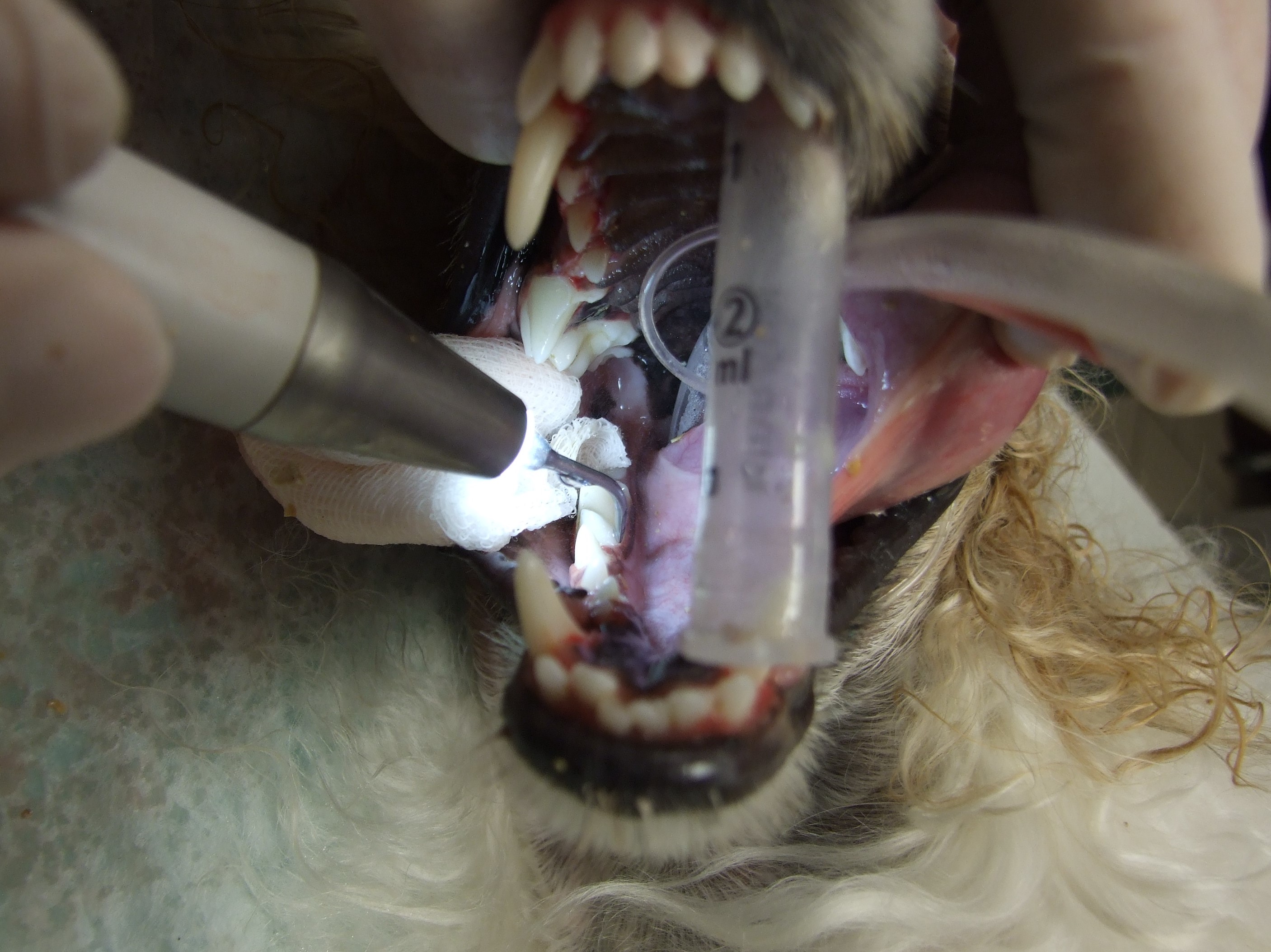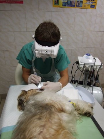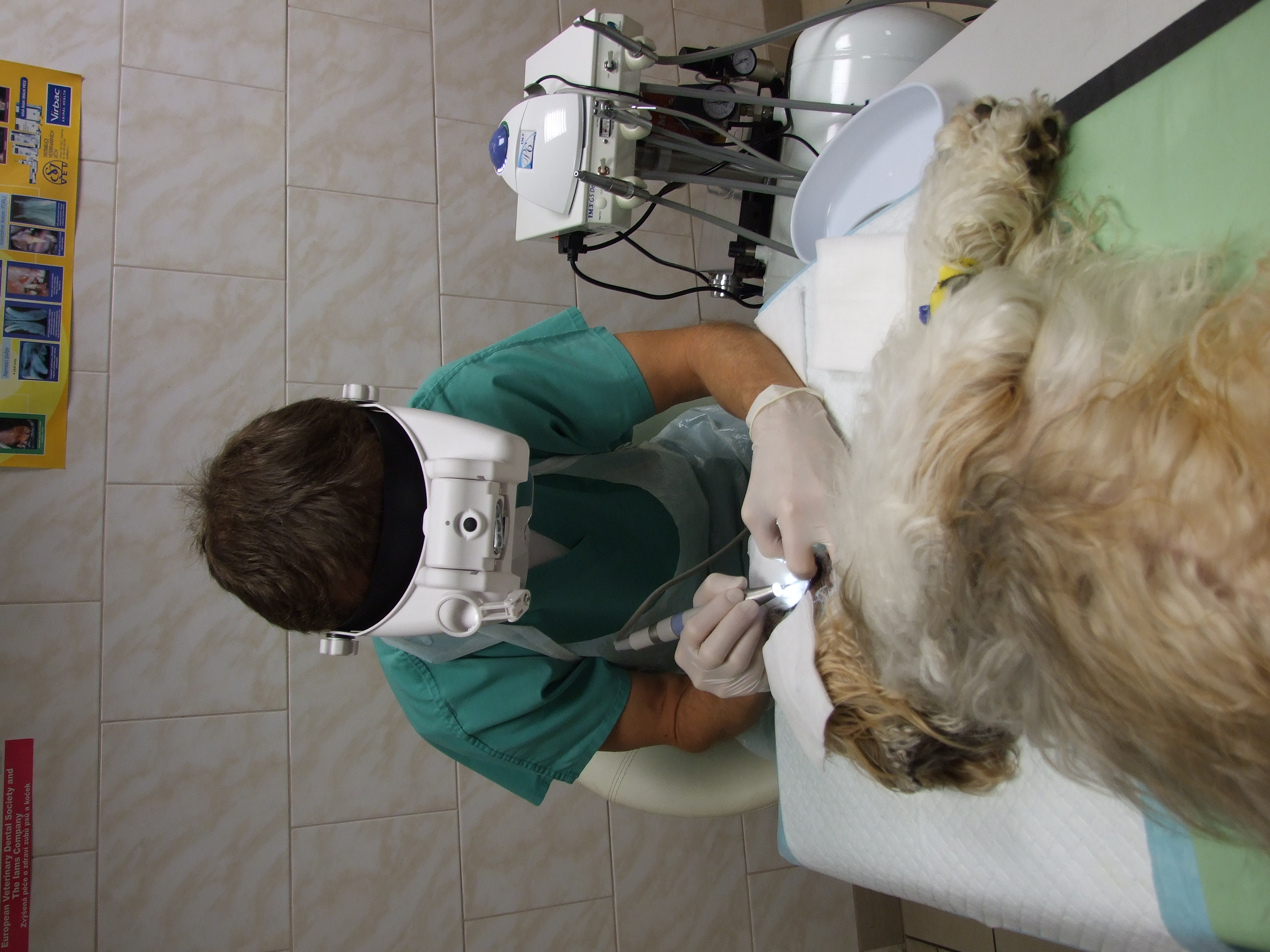Následný výkon probíhá na stomatologické a zobrazovací vyšetřovně. Pomocí výkoného, ale šetrného ultrazvukového přístroje s led osvětlením koncovky nástroje pro nejlepší vizualizaci pracovního pole odstraníme viditelný zubní kámen, následně vyšetříme každý jednotlivý zub z hlediska stavu parodontu gingivální kalibrovanou sondou a rozhodneme o jeho řešení. K tomu využíváme speciální náhlavní sadu zvětšujícách dioptrických brýlí s led osvětlením, které nám jednak operační pole 1,5 až 8x zvětší, ale také chrání oči stomatologa před aerosolem plným bakterií. Zuby s mírnou parodontitidou po odstranění zubního kamene pouze vyleštíme silikonovým kotoučem na low speed hlavě naší vysokoobrátkové kompresorové stomatologické věže IM3 de luxe. Zuby s parodontózou do 50% závěsu dočistíme v úrovni dásňového chobotu kyretou a vyleštíme. Zuby s paradontózou nad 50%, odhalenou furkací, nebo zuby poškozené opatrně extrahujeme - nestabilní a poškozené zuby jsou zdrojem bolesti a infekce, na takové zuby pacient stejně nekouše a jejich odstraněním se mu obvykle výrazně uleví od diskomfortu a zlepší příjem potravy. Vícekořenové zuby je obvykle potřeba rozbrousit stomatologickou vrtačkou na jednotlivé kořeny a ty pak po uvolnění z dásně opatrně chirurgicky, optimálně bez poškození, vyjmout. Následně celou tlamku vypláchneme dentální sprchou a dezinfikujeme roztokem chlorhexidinu. Po očištění a osušení srsti na hlavě následně s použitím antidota proti sedativní injekci pacienta vzbudíme a zavoláme majiteli, že si pro svého mazlíčka může přijít. Je-li to potřeba, několik dní po výkonu aplikujeme léky proti bolesti. Pacient tak obvykle během 1 až 1,5 hodiny opět odchází zcela vzhůru a orientovaný.