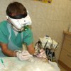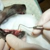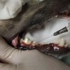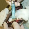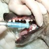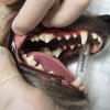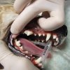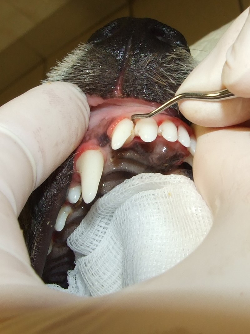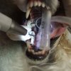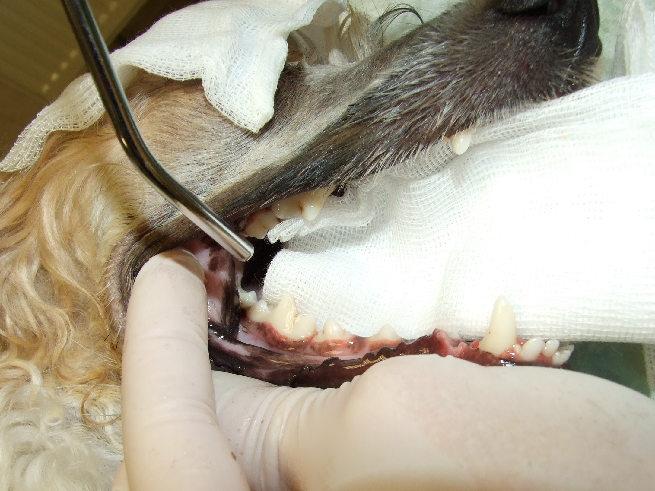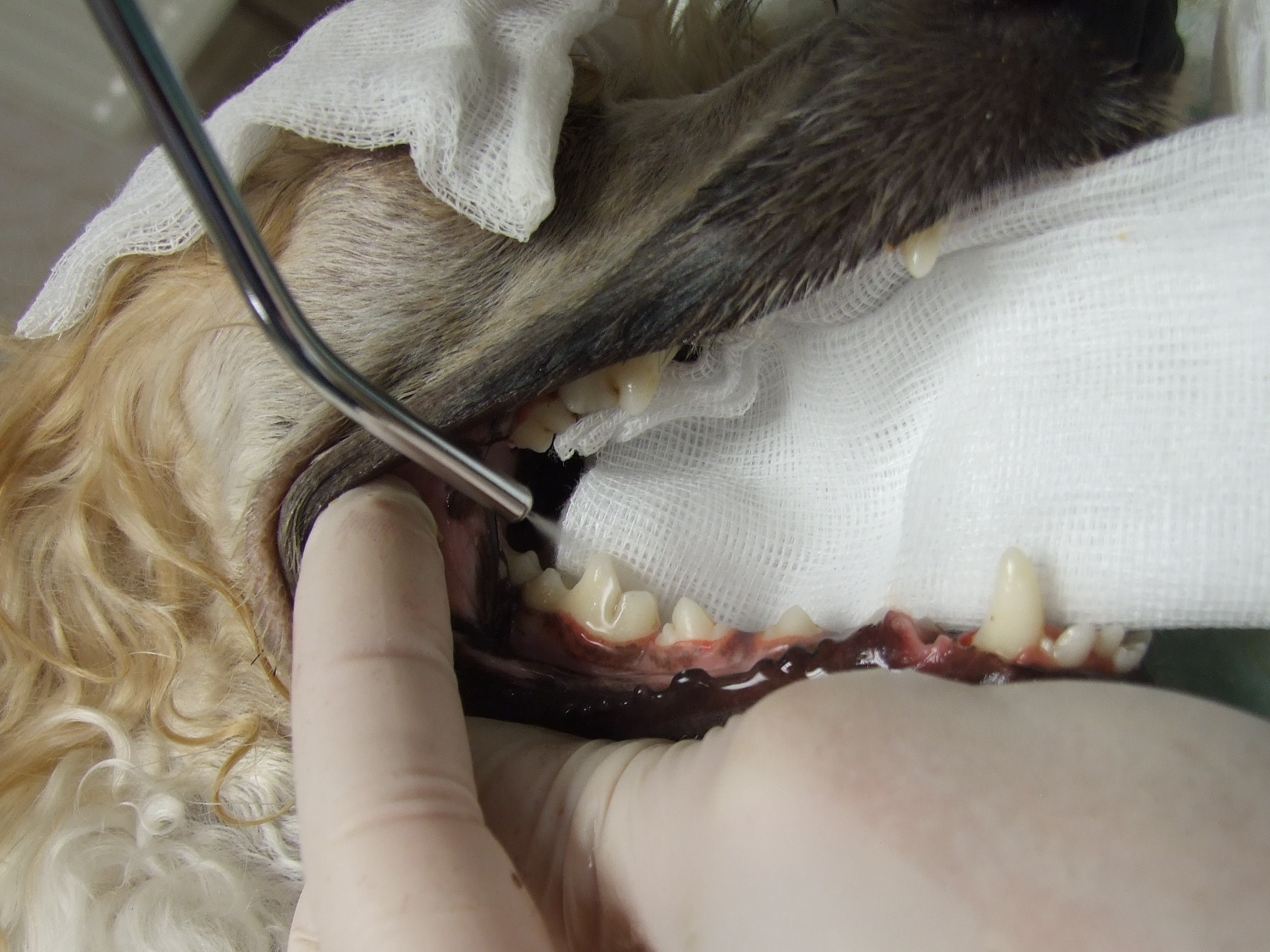 Následný výkon probíhá na stomatologické a zobrazovací vyšetřovně. Pomocí výkoného, ale šetrného ultrazvukového přístroje s led osvětlením koncovky nástroje pro nejlepší vizualizaci pracovního pole odstraníme viditelný zubní kámen, následně vyšetříme každý jednotlivý zub z hlediska stavu parodontu gingivální kalibrovanou sondou a rozhodneme o jeho řešení. K tomu využíváme speciální náhlavní sadu zvětšujícách dioptrických brýlí s led osvětlením, které nám jednak operační pole 1,5 až 8x zvětší, ale také chrání oči stomatologa před aerosolem plným bakterií. Zuby s mírnou parodontitidou po odstranění zubního kamene pouze vyleštíme silikonovým kotoučem na low speed hlavě naší vysokoobrátkové kompresorové stomatologické věže IM3 de luxe. Zuby s parodontózou do 50% závěsu dočistíme v úrovni dásňového chobotu kyretou a vyleštíme. Zuby s paradontózou nad 50%, odhalenou furkací, nebo zuby poškozené opatrně extrahujeme - nestabilní a poškozené zuby jsou zdrojem bolesti a infekce, na takové zuby pacient stejně nekouše a jejich odstraněním se mu obvykle výrazně uleví od diskomfortu a zlepší příjem potravy. Vícekořenové zuby je obvykle potřeba rozbrousit stomatologickou vrtačkou na jednotlivé kořeny a ty pak po uvolnění z dásně opatrně chirurgicky, optimálně bez poškození, vyjmout. Následně celou tlamku vypláchneme dentální sprchou a dezinfikujeme roztokem chlorhexidinu. Po očištění a osušení srsti na hlavě následně s použitím antidota proti sedativní injekci pacienta vzbudíme a zavoláme majiteli, že si pro svého mazlíčka může přijít. Je-li to potřeba, několik dní po výkonu aplikujeme léky proti bolesti. Pacient tak obvykle během 1 až 1,5 hodiny opět odchází zcela vzhůru a orientovaný.