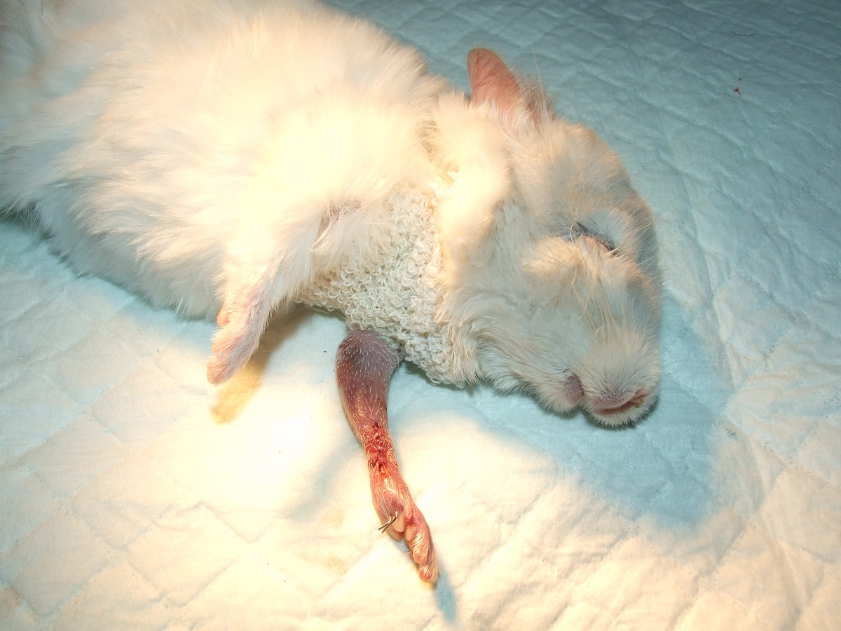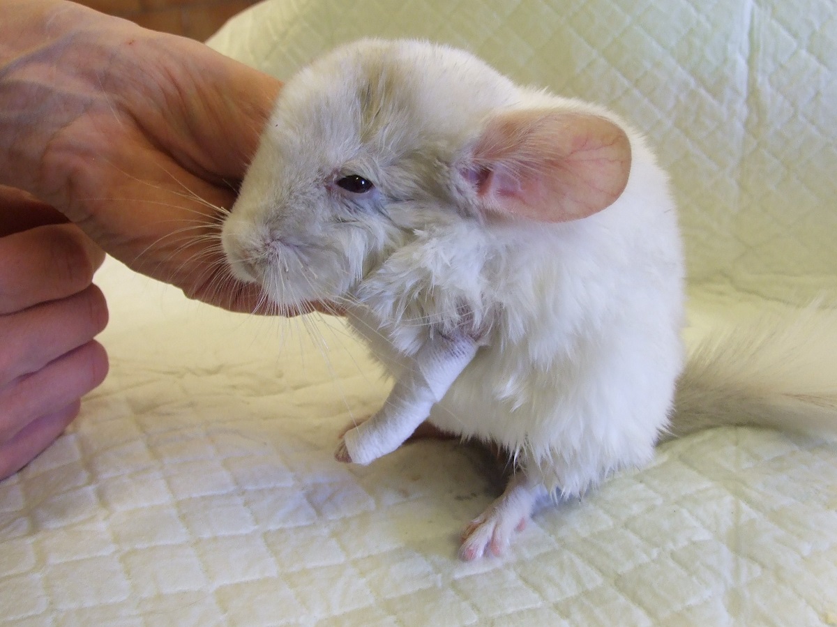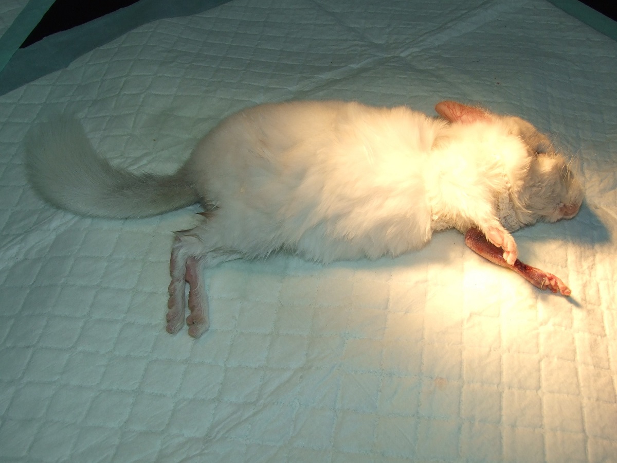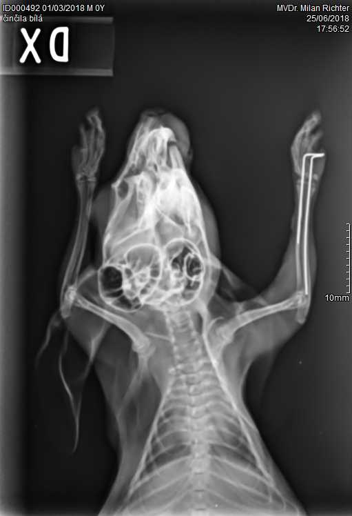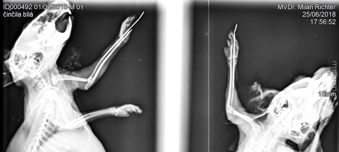 Velmi komplikovaná fraktura obou předloketních kostí u drobné činčily, jelikož se tak drobné implatáty běžně nevyrábějí, řešili jsme ji implantací nitrodřeňových hřebů vyrobených z injekčních jehel. Pacient se kompletně a bez následků uzdravil, po vyjmutí hřebů nožičku naplno používá.