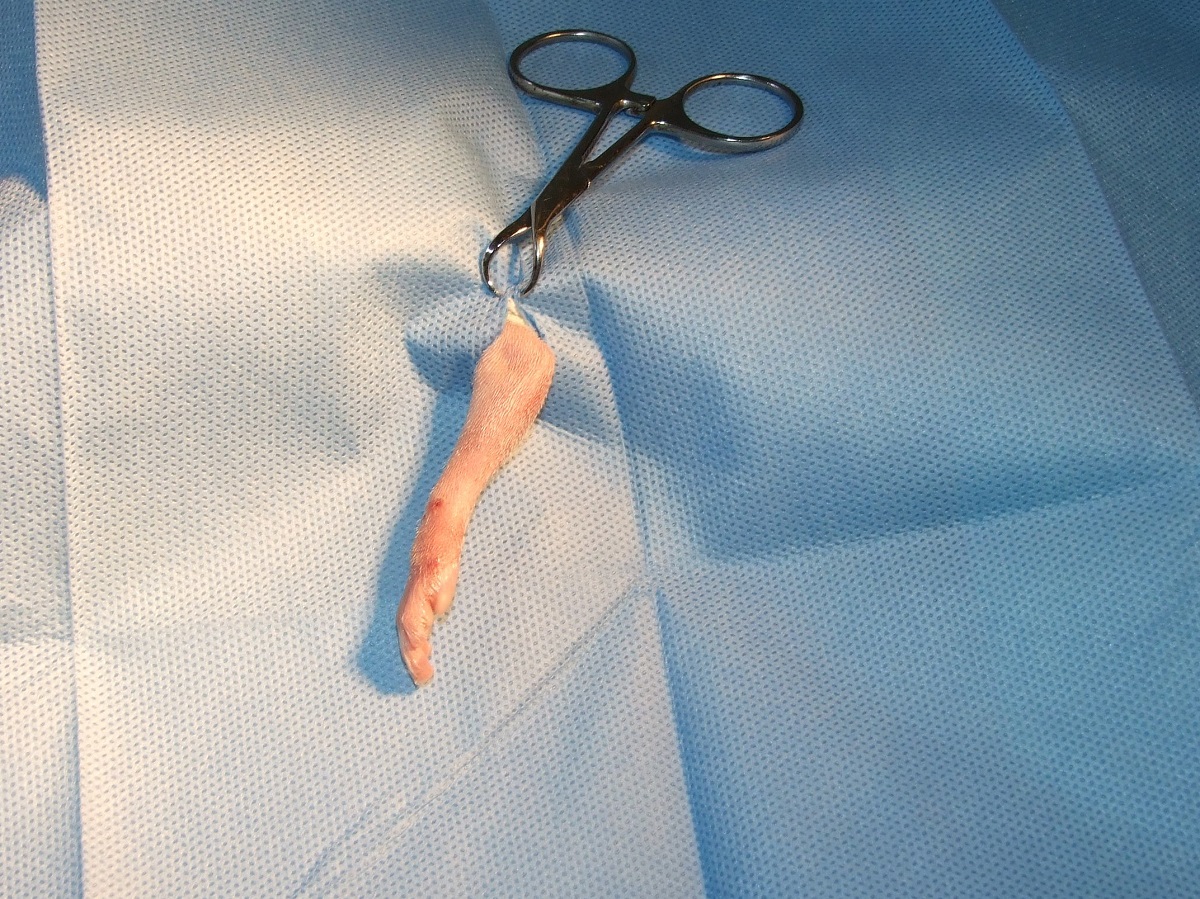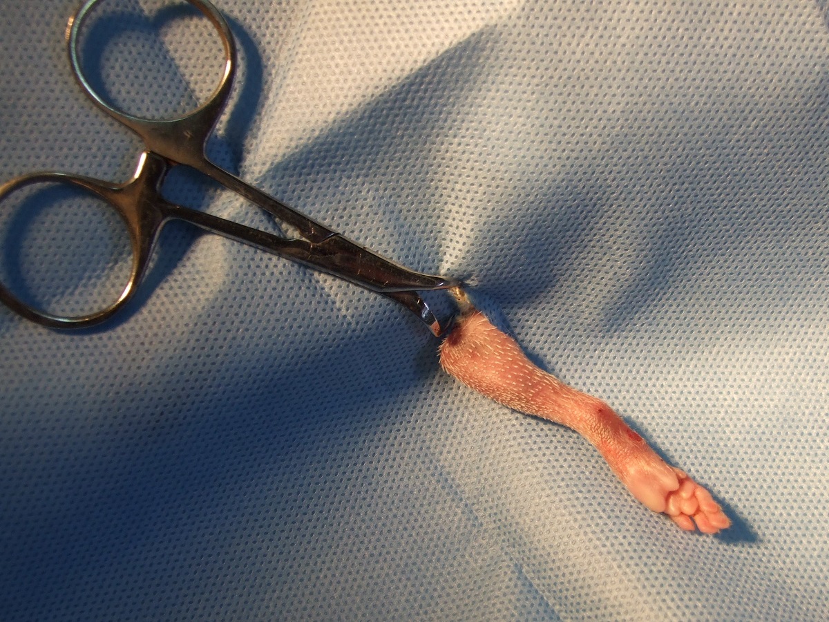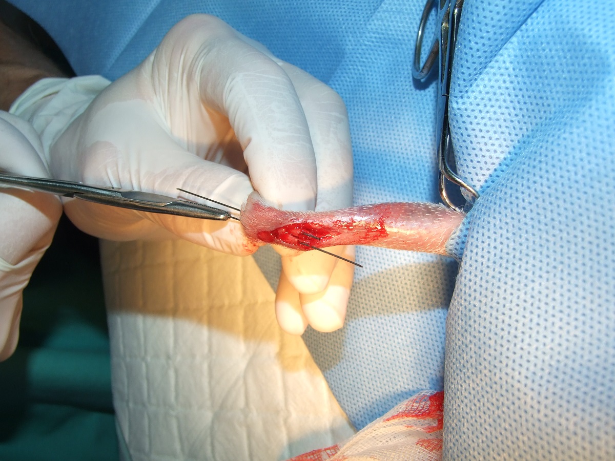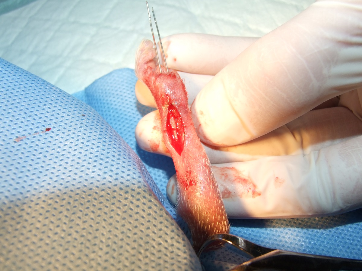 Velmi komplikovaná fraktura obou předloketních kostí u drobné činčily, jelikož se tak drobné implatáty běžně nevyrábějí, řešili jsme ji implantací nitrodřeňových hřebů vyrobených z injekčních jehel. Pacient se kompletně a bez následků uzdravil, po vyjmutí hřebů nožičku naplno používá.