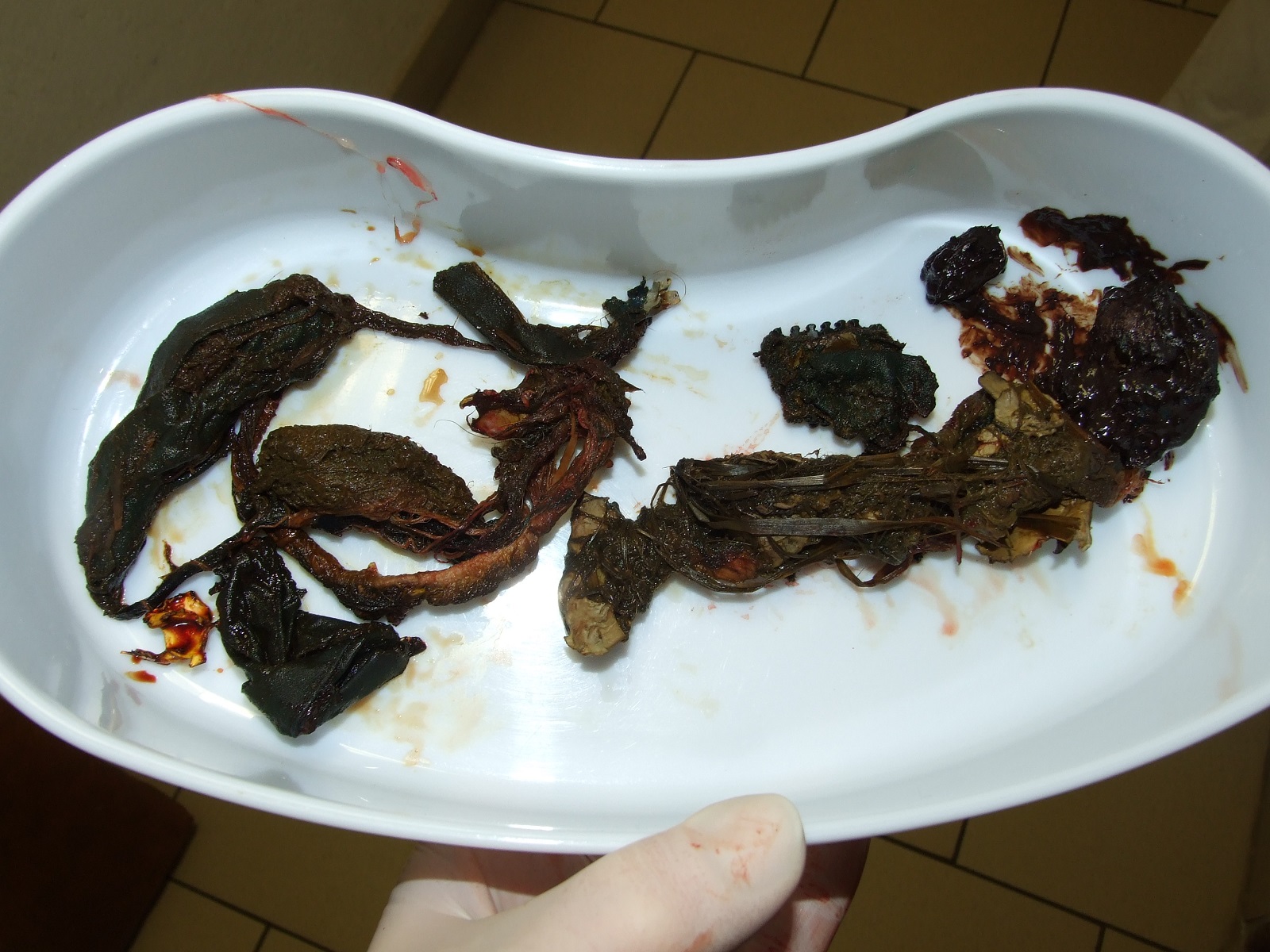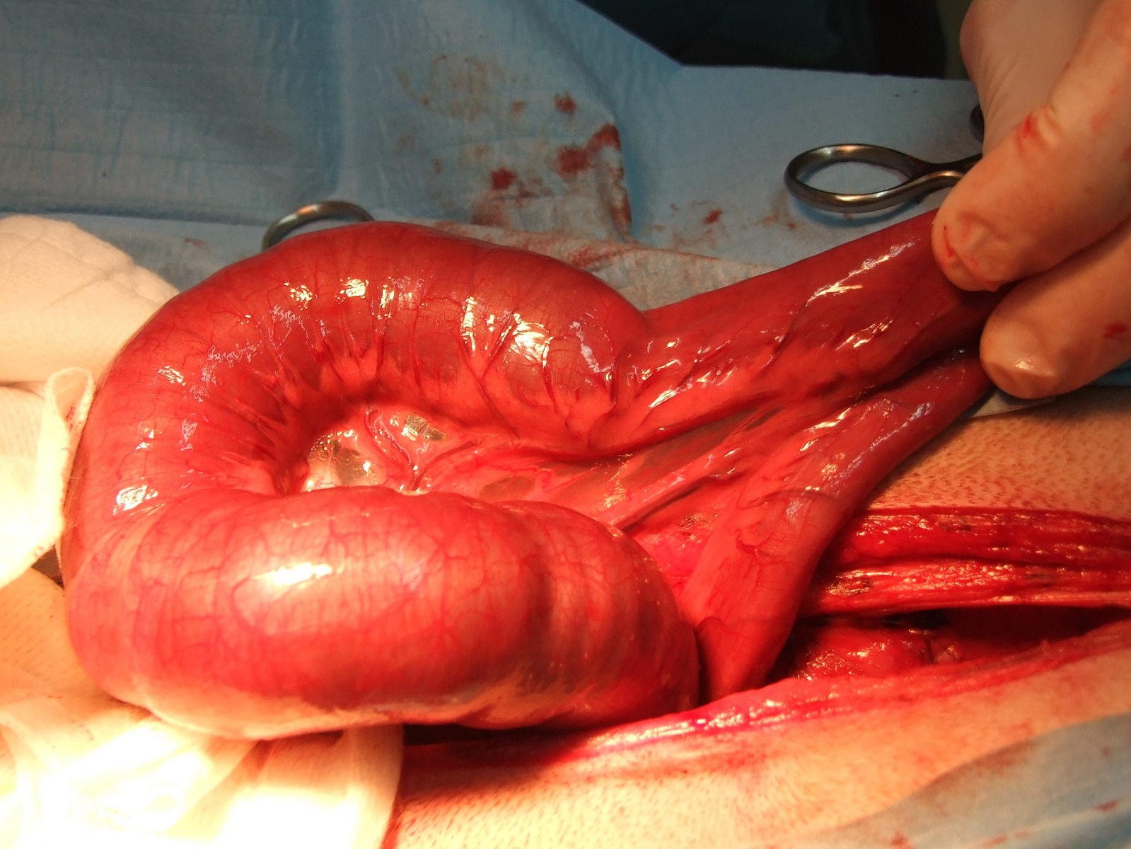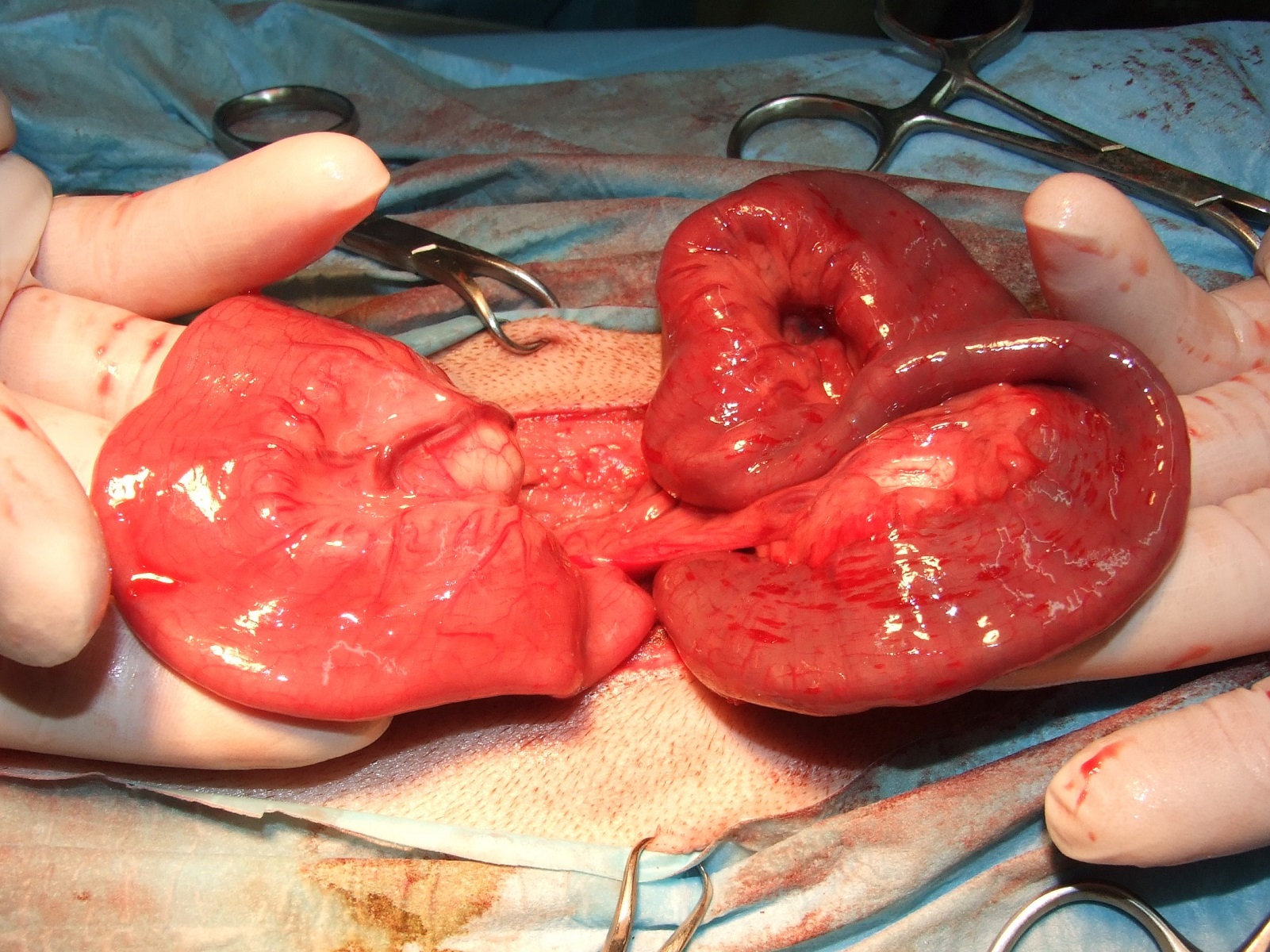 Lineární cizí těleso u 11měsíčního ridgebacka - z rozkousané bundy se zipem a plastového předmětu se vytvořilo lineární cizí těleso bezprostředně ohrožující život, které se na jednom konci zachytilo v žaludku a na druhý konec se navlékla cca 1/2 tenkého střeva. Za ní se bohužel vytvořila tzv invaginace - vchlípení jednoho úseku tenkého střeva do druhého. Kovový jezdec, který byl velmi dobře patrný na rentgenu, byl paradoxně volně v tlustém střevě a nezpůsoboval významnější obtíže. Museli jsme na několika místech vstoupit do žaludku a střev, přerušit a vyjmout cizí těleso, uvolnit vchlípení, zrevidovat životaschopnost střev a po zhodnocení stavu a perfuze krví uvést vše do původního stavu a dutinu břišní po výplachu uzavřít. Pacientovi se daří dobře, střeva fungují a už sám přijímá potravu.