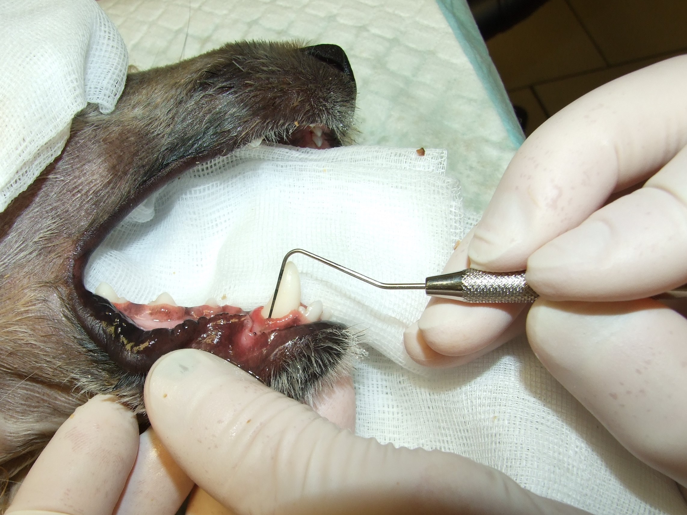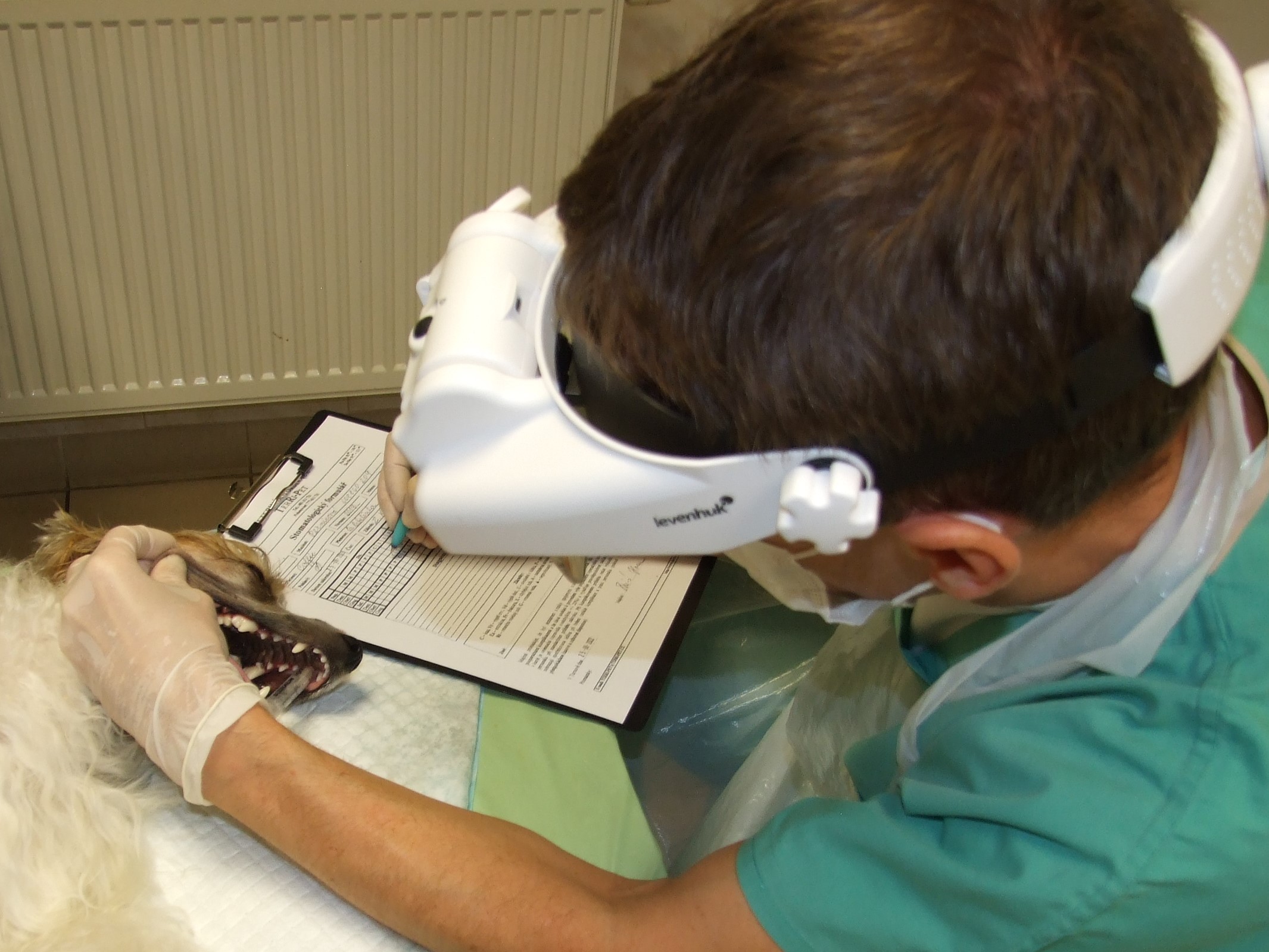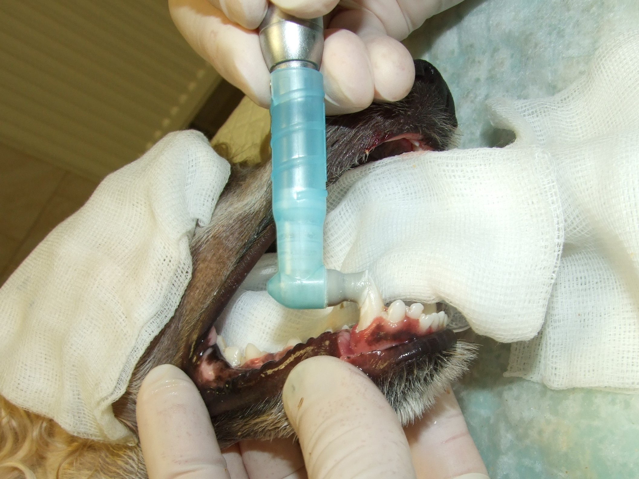 Následný výkon probíhá na stomatologické a zobrazovací vyšetřovně. Pomocí výkoného, ale šetrného ultrazvukového přístroje s led osvětlením koncovky nástroje pro nejlepší vizualizaci pracovního pole odstraníme viditelný zubní kámen, následně vyšetříme každý jednotlivý zub z hlediska stavu parodontu gingivální kalibrovanou sondou a rozhodneme o jeho řešení. K tomu využíváme speciální náhlavní sadu zvětšujícách dioptrických brýlí s led osvětlením, které nám jednak operační pole 1,5 až 8x zvětší, ale také chrání oči stomatologa před aerosolem plným bakterií. Zuby s mírnou parodontitidou po odstranění zubního kamene pouze vyleštíme silikonovým kotoučem na low speed hlavě naší vysokoobrátkové kompresorové stomatologické věže IM3 de luxe. Zuby s parodontózou do 50% závěsu dočistíme v úrovni dásňového chobotu kyretou a vyleštíme. Zuby s paradontózou nad 50%, odhalenou furkací, nebo zuby poškozené opatrně extrahujeme - nestabilní a poškozené zuby jsou zdrojem bolesti a infekce, na takové zuby pacient stejně nekouše a jejich odstraněním se mu obvykle výrazně uleví od diskomfortu a zlepší příjem potravy. Vícekořenové zuby je obvykle potřeba rozbrousit stomatologickou vrtačkou na jednotlivé kořeny a ty pak po uvolnění z dásně opatrně chirurgicky, optimálně bez poškození, vyjmout. Následně celou tlamku vypláchneme dentální sprchou a dezinfikujeme roztokem chlorhexidinu. Po očištění a osušení srsti na hlavě následně s použitím antidota proti sedativní injekci pacienta vzbudíme a zavoláme majiteli, že si pro svého mazlíčka může přijít. Je-li to potřeba, několik dní po výkonu aplikujeme léky proti bolesti. Pacient tak obvykle během 1 až 1,5 hodiny opět odchází zcela vzhůru a orientovaný.